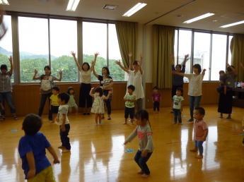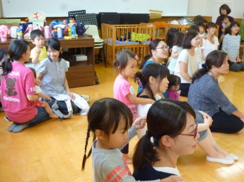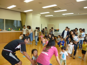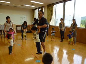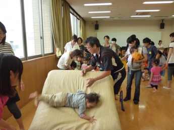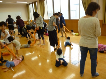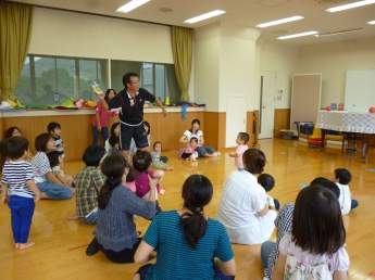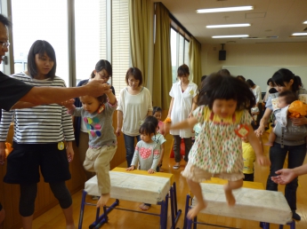 スッパマン先生の2回目に幼児運動の日です。始まる前に、お姉さん先生が大型絵本で絵本タイム。体を動かしたくなる絵本です。ねこさんがピヨーン、犬さんがピヨーン