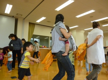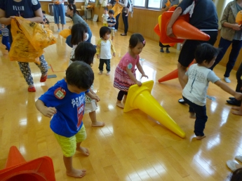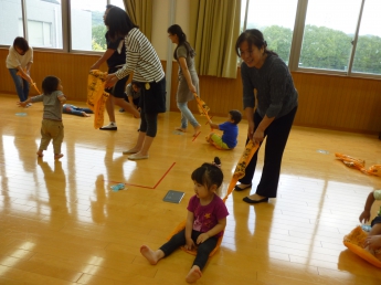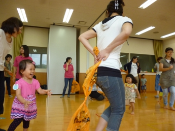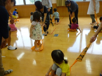 ビニール袋を使って遊びます。脇の下に2枚つなげた袋をはさんで、ジャンプジャンプ