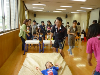 今度は寝転がって袋を持って、お母さんが引っ張ります。スーパーマンポーズ、かっこいい!