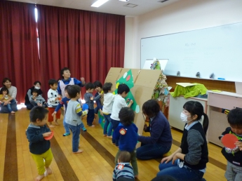 先週のアートの時間に作った素敵なツリーの前で親子ふれあいタイムの開始
