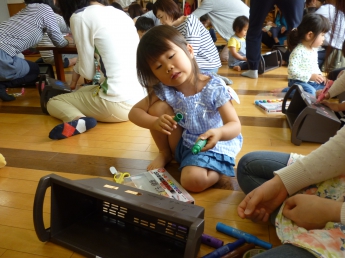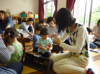 今年度2回目のポッケです。朝ポッケに来たら、受付で名前を言って出席カードにシールを貼ります。ポッケのお歌を歌ったり、お名前を呼ばれたら返事をするなど、家から離れた社会のルールや流れを、繰り返すことで覚えていきます。