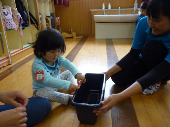 お水をあげて、手を掛けることで種から芽が出ることを学びます