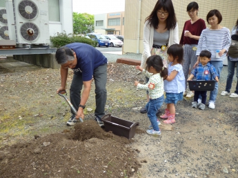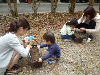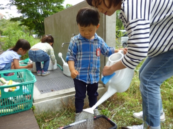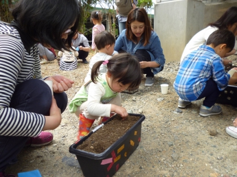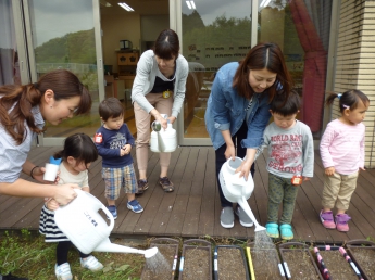 種を蒔いたら、おかあさんと一緒にお水をあげます