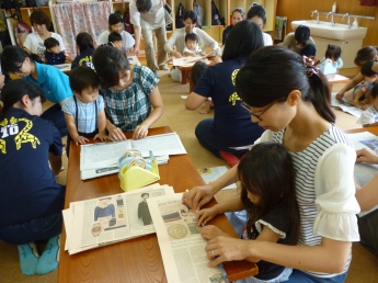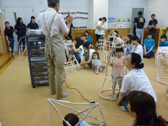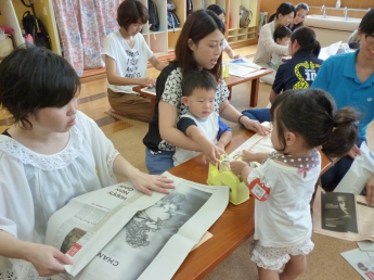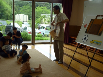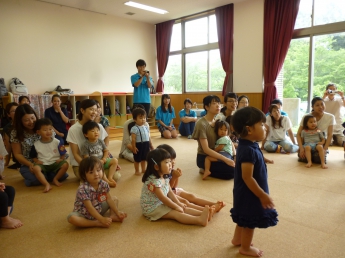 村上ゼミのお姉さんやお兄さんがたくさんいるので、子どもたちもちょっぴり緊張気味。でも、なんだかいつもと違う楽しいことが始まる予感。パネルシアターから、始まり~始まり~