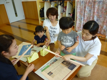丸まったら、セロテープで貼って棒状にします。セロテープ使うの楽しいね