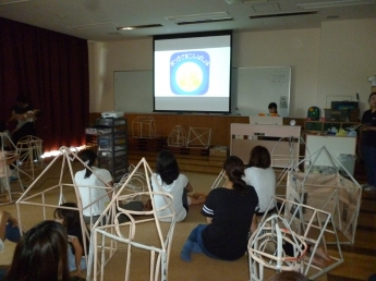 最後に音楽を聞きながら、スライドで絵本を鑑賞。「少し暗くなりますが、自分で作ったお家の中で見ると安心ですよ」村上先生の説明を聞いて