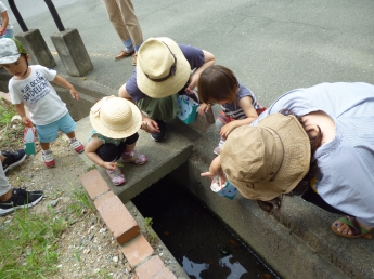 お母さんと水路をのぞきます。めだかがいっぱい!