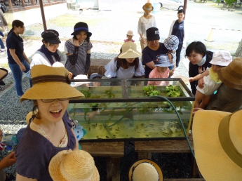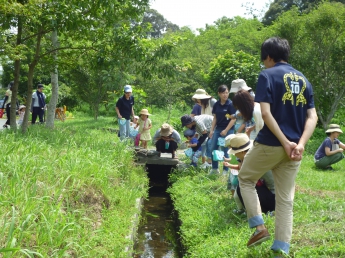 こどもむらエリアの水路も生き物がいっぱい。めだか・フナ・おたまじゃくし・アメンボ・・・