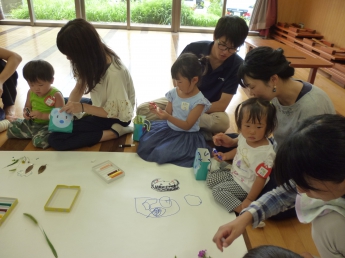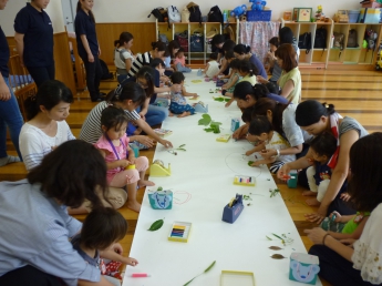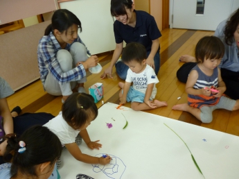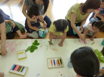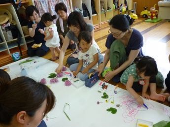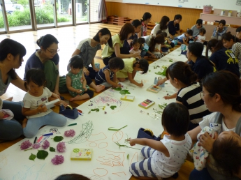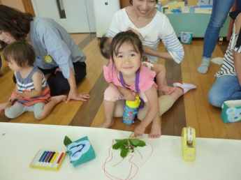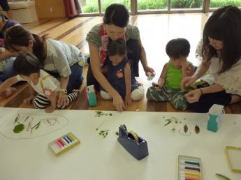 長~いロール紙に、採ってきた草や花など自由に貼って、カラーペンでお絵描きします