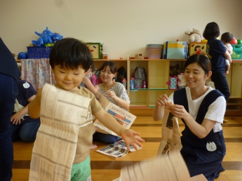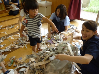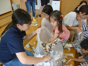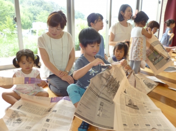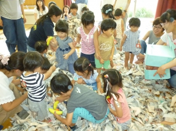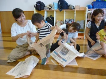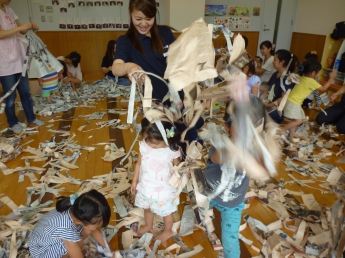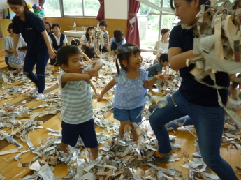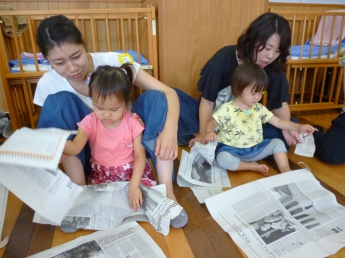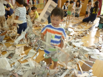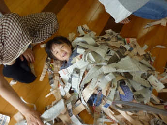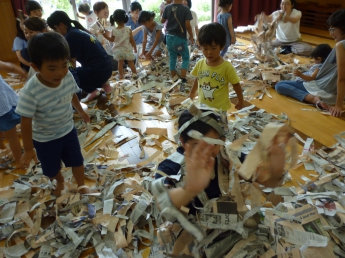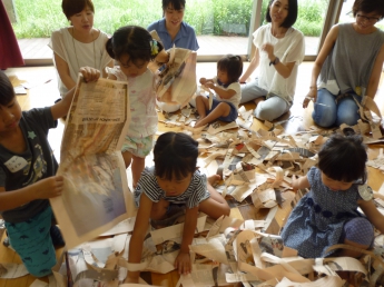 今日は新聞紙を使って遊びます。ちぎったり、丸めたり、ばらまいたり・・・おうちではなかなかできないダイナミックな遊びをポッケで体験します。