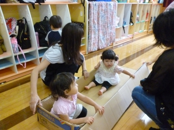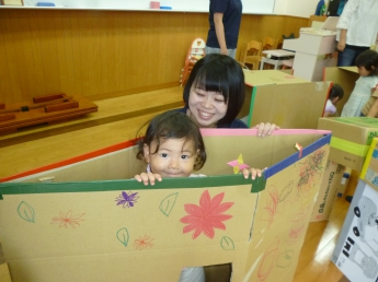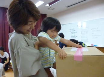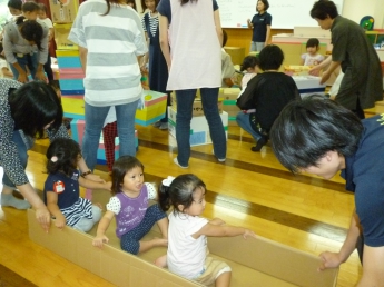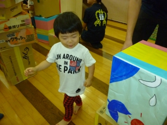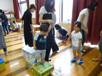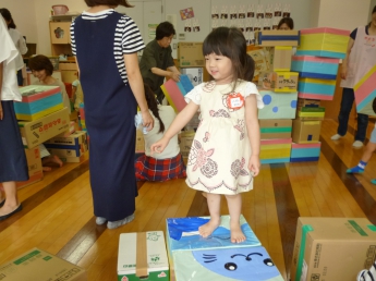 一息つけたら、お次は段ボール遊び。たくさんの段ボールに囲まれて、みんなビックリ。お母さんと協力して段ボールを積みました