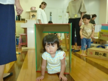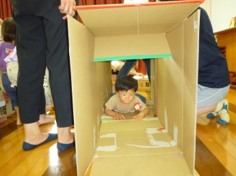 大きな段ボールはトンネルにもなります。満面の笑顔で、トンネルくぐり