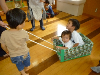大きな段ボールは電車に変身。お兄さんは運転手。引っ張るの頑張ってください