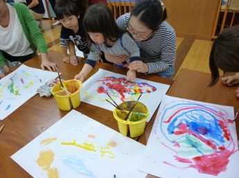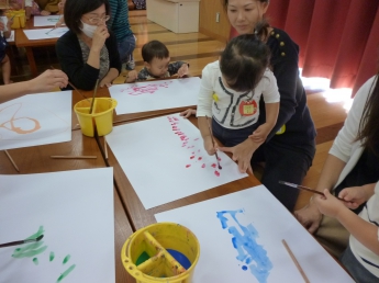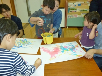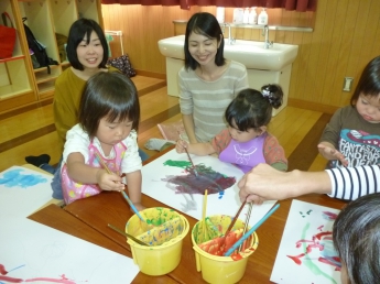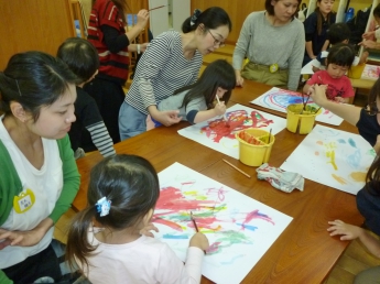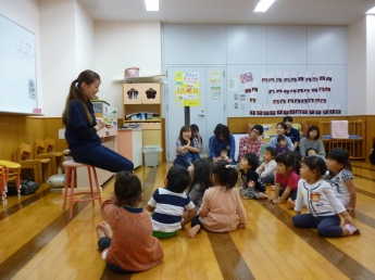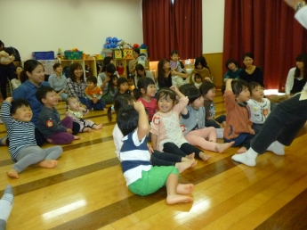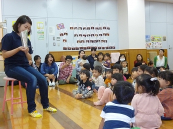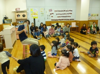 始める前に、お姉さんやお兄さんが形や色に興味が沸くような手遊びや絵本の読み聞かせをしてくれました。