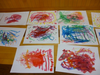 前期の「ロール紙に絵を描こう」ではクレヨンや水性ペンを使用しましたが、今回は筆を使って絵を描きます。
