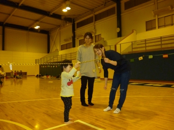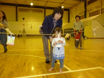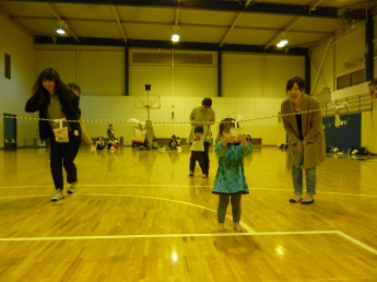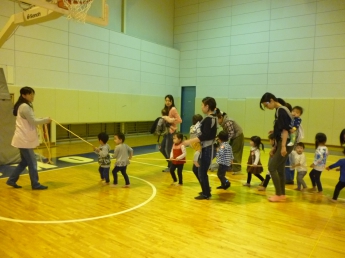 今日は広い体育館で遊びます。みんなでロープにつかまって、出発進行~