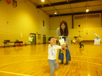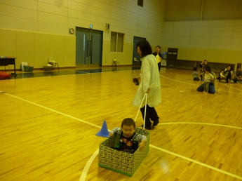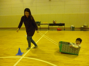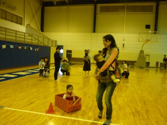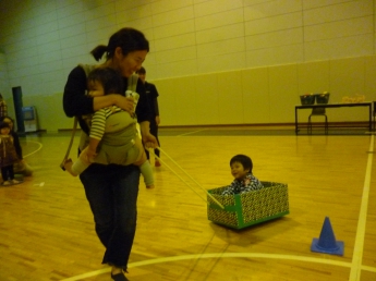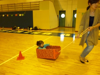 段ボールの車で競争だぁ。お母さん、頑張って