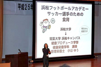 NPO浜松フットボールアカデミーの2013年度の選手入団式とNPO設立3周年記念セミナーが常葉大学浜松キャンパスで開催され、本学健康プロデュース学部 健康栄養学科の小山ゆう講師が「成長期のサッカー選手に必要な食事(栄養)」と題して食育セミナーを行いました。