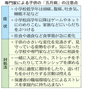 五月病は正式な病名ではなく、環境の変化がストレスにつながり、無気力や虚脱感、食欲低下などを引き起こす状態を言う。社会人や大学生に多いとされてきたが、常葉大大学院の小松郁夫教授は「少子化やテレビゲームの普及などを背景に、人間関係作りが苦手な子供が増え、今は小中学生の間でも珍しくない」と指摘する。