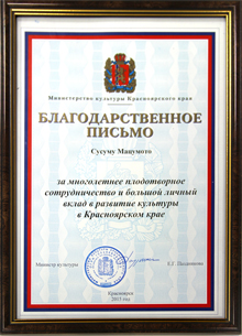 クラスノヤルスク地方の文化発展における、長年の絶大なる尽力と献身的な貢献が評価され、今回の受賞へつながりました。