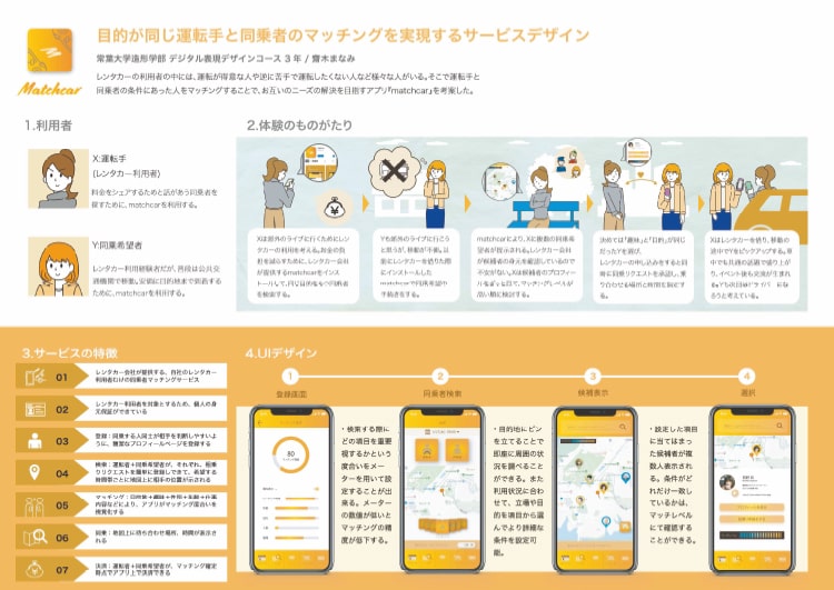 産業につながるデザインを学ぶデジタルコミュニケーションデザイン領域の授業は、多くの企業と協同で新規事業の開発を行っています。東京の大手広告会社や人材ビジネス会社をはじめ、静岡銀行、鈴与レンタカーなど、未来のサービス開発を企業と学生が一緒に考えて、デジタルアプリケーションを含んだサービスを設計します。学生は「人間中心デザイン」という専門スキルと社会人の働き方を同時に学ぶ機会となっています。