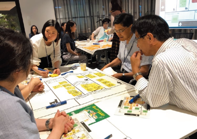 静岡県を代表する茶産業を活性化するために、経営者や個人事業主、インストラクターなどさまざまな人々が集まる「茶と人」フロンティア静岡会議準備会が誕生し、教授と共にアート領域とデジタルコミュニケーションデザイン領域の7名の学生が社会人グループに加わり、専門技術を使って、ビジネスモデルをデザインしました。2019年3月より11月にかけて7回の合同ワークショップを行い、2020年2月に産業界や行政の多くの人に対して、観光プランやお茶の学校、商品開発など11のデザイン案を発表しています。