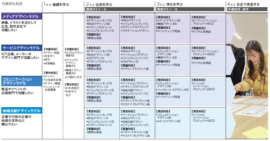 デジタルコミュニケーションデザイン領域の科目では、モノの設計から、人々の豊かな体験を構想するまでの知識と技術を学びます。原点であるグラフィックを基盤に、写真や映像、イラストレーションなどのコンテンツ科目とともに、情報デザイン、UX/UI、サービスデザイン、ソーシャルデザインといった応用科目、社会や産業と繋がるプロジェクト科目で、企画から制作、提案までを学ぶ内容で構成されています。