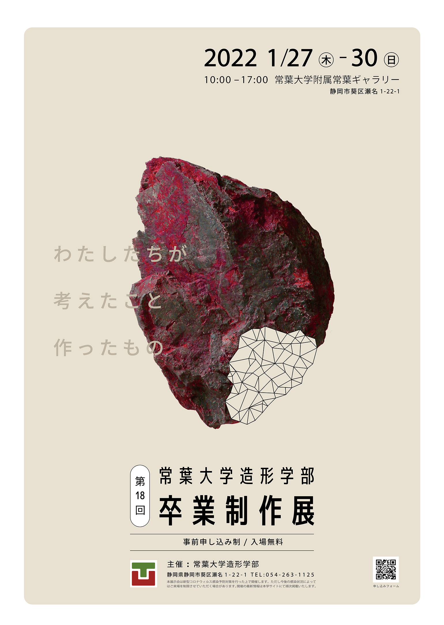 2022年1月27日(木曜日)~1月30日(日曜日)の日程で開催を予定しておりました、第18回卒業制作展についてお知らせがございます。ご存知の通り感染症の急激な拡大に伴い、静岡県においてもまん延防止重点措置が適用される運びとなっており、同様に本学の行動指針レベルを引き上げる予定です。