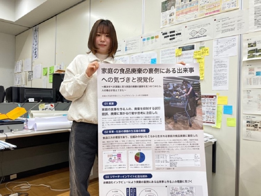 第1回はビジュアルデザインコースの貝瀬優季さん。「家庭の食品廃棄の裏側にある出来事への気づきの探究」を行い、それをインフォグラフィックにて視覚化してまとめています。食品ロスに着目したきっかけや、見にきてくれた人に伝えたいこと、卒業制作を通じた自身の成長について伺いました。