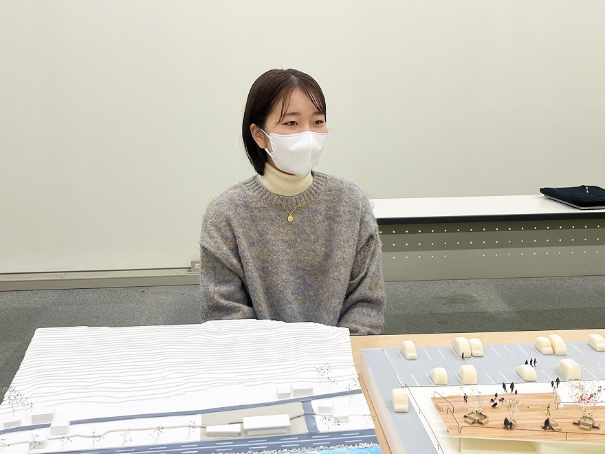 環境デザインコースからは、「道の駅 くのう」の模型を設計・制作した海老岡夏希さんにインタビューをしました。海老岡さんの静岡にかける思いや制作までの道のりなどをお伺いしています。