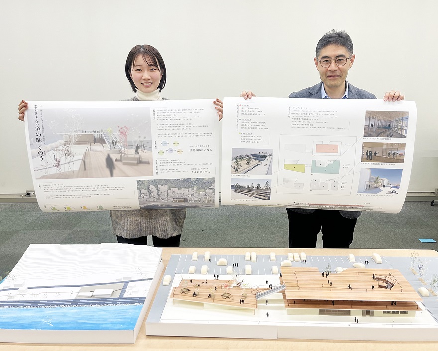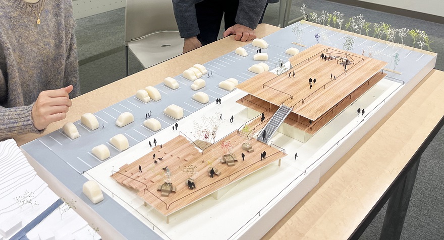 指導教員の土屋先生からは、「普段から道の駅として利用できるだけでなく、津波の際は避難タワーとしての役割も担っています。ハザードマップで見ると、この敷地は10分以内で津波が到達し、想定高さは3m程度。地震時にこの建物にいる人と、このそばの道路を走っている自動車がすぐに逃げ込める場所となる想定ができます」との補足がありました。選んだ立地は海が近く、災害時には津波の来る地域。「道の駅 くのう」は、さまざまな観点から、人々の拠り所となるような綿密な設計がされていました。