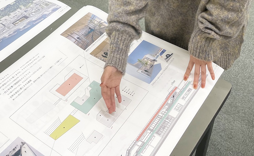 海老岡さんは卒業制作にあたり、「道の駅」がどういった場所なのかを知ることから始めました。山梨県などの近場で行ける道の駅は実際に足を運んだものの、現在はコロナ禍もあり、あまり遠くに行けないという問題がありました。インターネットで事例を調べてさまざまな道の駅の良いポイントをまとめたり、以前旅行の際に立ち寄った道の駅を思い出したりするなど、これまでの経験や知識を活かすことが出来たと話してくれました。