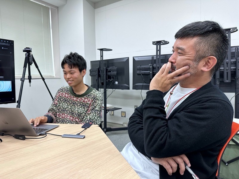 映像の確認をする八木さんと指導教員の洞口先生