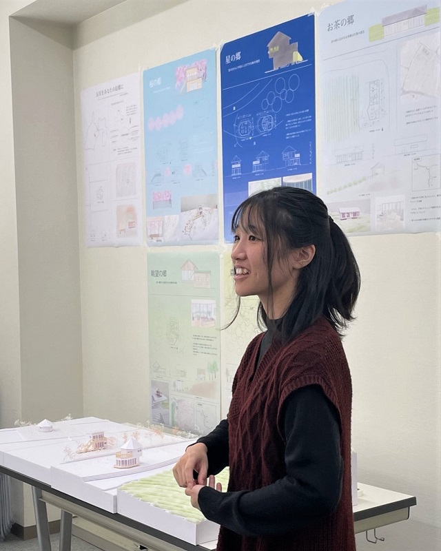 環境デザインコースからは、「玉川をあなたの故郷に」というテーマで建築設計に取り組んだ岡部祐佳里さんにインタビューをしました。作品制作にいたるきっかけやについて伺いました。