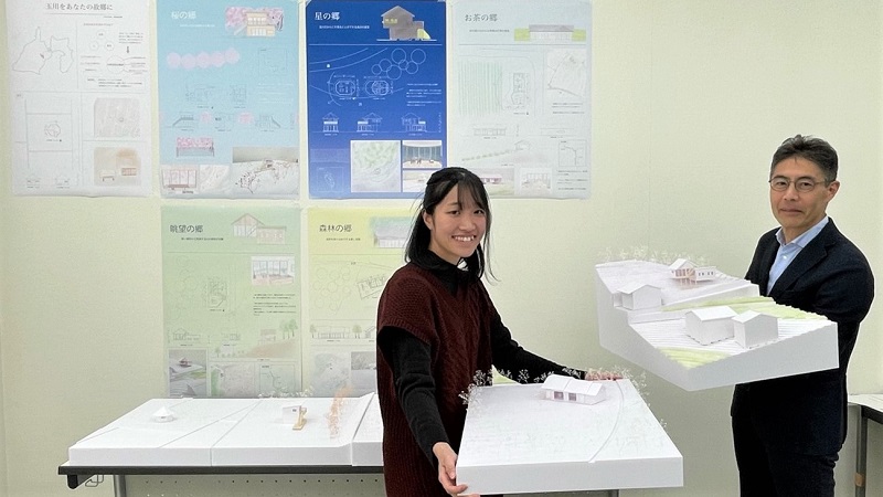 私の地元は玉川という静岡の山あいにある場所で、人口減少や少子高齢化が進んでしまっています。玉川は魅力がたくさんある地域なので、このようになってしまっていることはとても残念に思いました。そのため、いろんな人に玉川の魅力が伝わればいいなと思い、考えた結果「分散型宿泊施設」を計画しました。玉川は高低差のある地形になっています。また、飲食店や店が散らばっているため1か所に宿泊施設をまとめてしまうと玉川全体を楽しんでもらえないと思いました。そのため、点在させることでそれぞれの地域を楽しんでいただけたらなと思い、一棟貸しのように一棟一棟に泊まれる宿泊施設を計画しました。