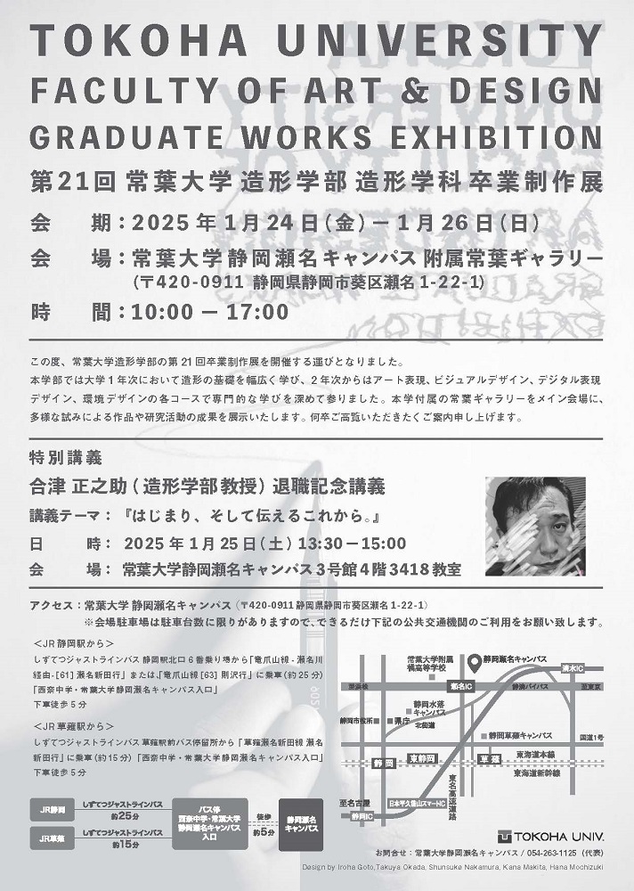 | 会 期 | 2025年1月24日(金曜日)~1月26日(日曜日) 10時00分~17時00分 ※会期中に、造形学部の退職教員最終講義『はじまり、そして伝えるこれから。』(合津正之助 教授)を開催します。
