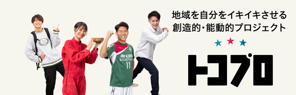 地方自治体や企業と連携し、地域の課題解決と活性化を目指すプロジェクト「トコプロ」には、学生の半数以上が参加。バリエーション豊かなプロジェクトは、いずれもマナビの場として自らを成長させ、地域の未来につながるチカラを培ってくれる。