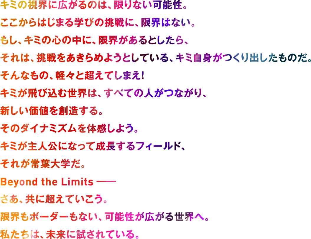 本学の建学の精神「より高きを目指して〜Learning for Life〜」は、高い目標に向かってチャレンジし、学び続ける姿勢こそ、常葉の精神であることを示しています。そこから生まれたブランドスローガン「Beyond the Limits」は、学生生活を通して「小さな挑戦」を繰り返しながら、飛躍につなげてもらいたいという思いを込めたものです。