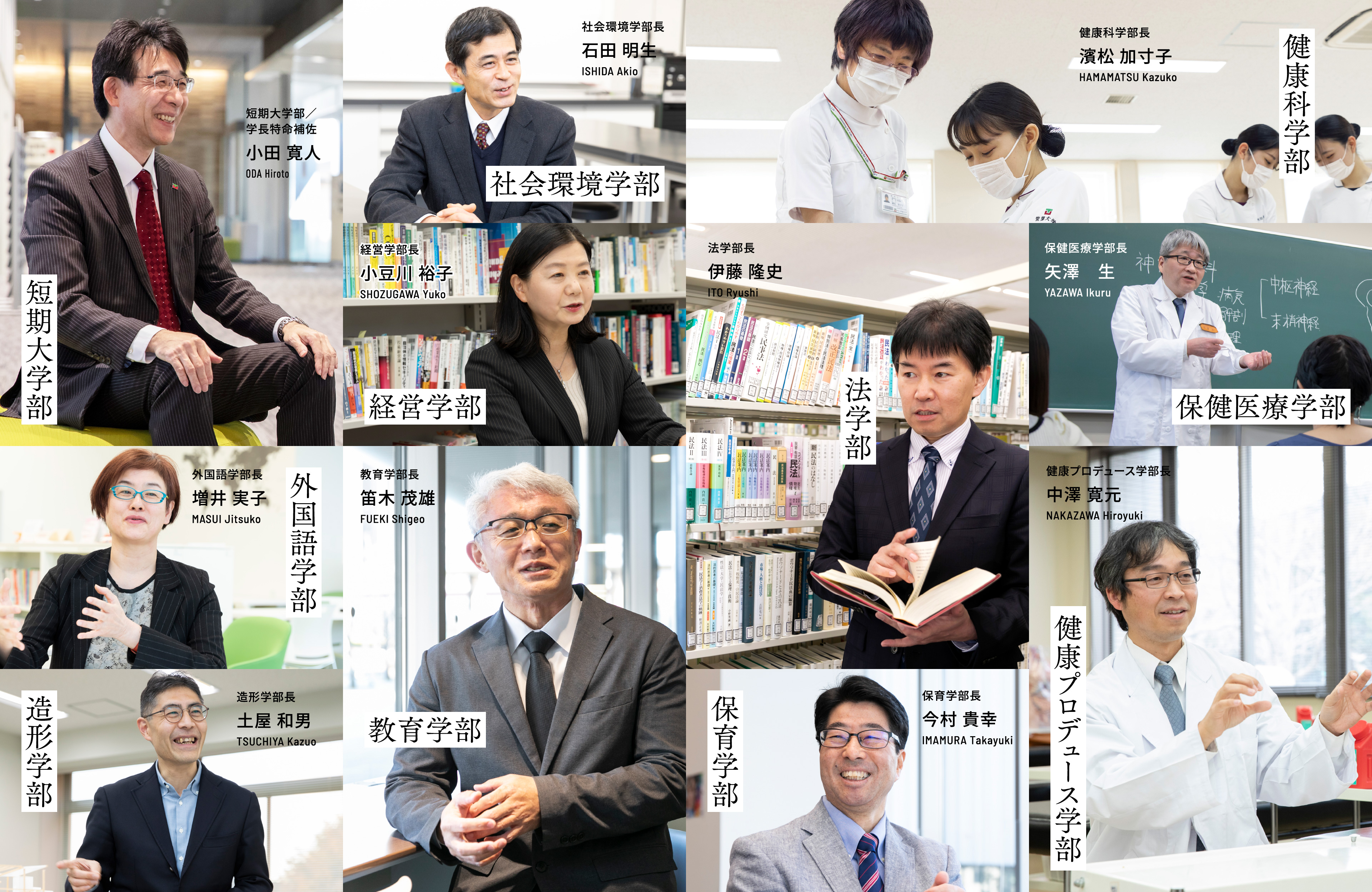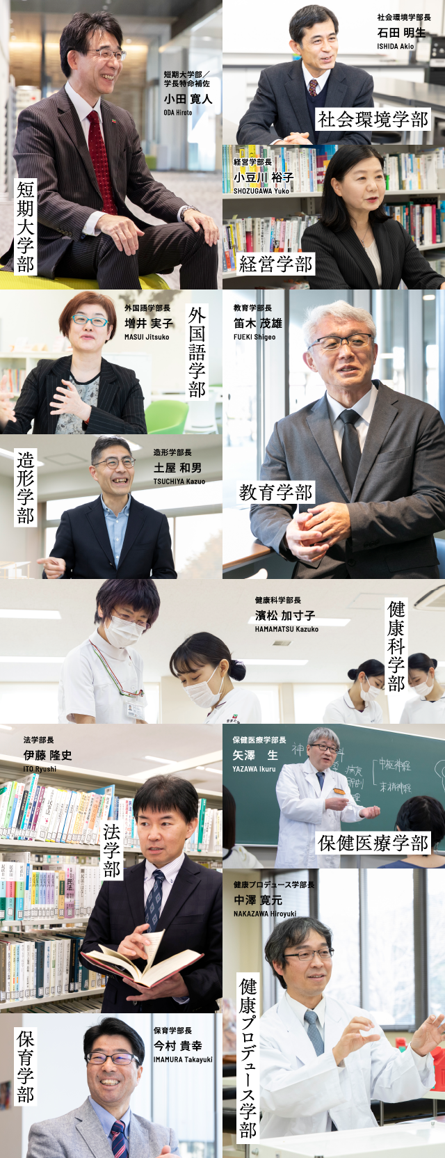 10学部19学科で構成される常葉大学と、2科で構成される短期大学部。いずれも特徴的な学びを通して、学生一人ひとりの可能性を開花させ、社会に飛び立つ日まで成長をサポートする。その実現を約束する各学部の強みとは何か、さらにステージアップするためのビジョンも含め学部長の皆さんに語ってもらった。