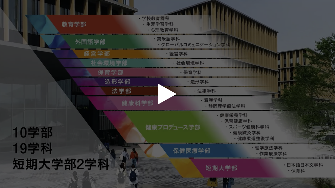 本学は静岡県最大の私立大学として約8,000人の学生を擁し、静岡市に3つ、浜松市に1つ、計4つのキャンパスを構えています。その内「経営」「健康プロデュース」「保健医療」の3学部と大学院の「健康科学研究科」を置く「浜松キャンパス」を、2028年4月、JR浜松駅至近に移転し、新たなスタートを切ることになりました。