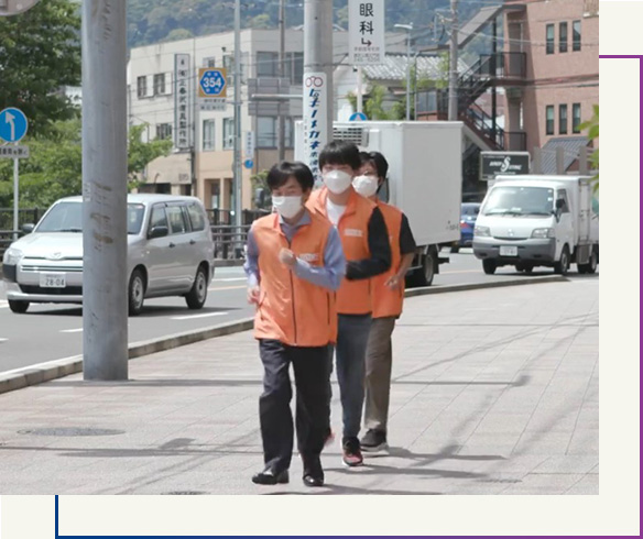 「JUSTICE」では、常時活動として週2回程度大学付近の小学校の下校時間に合わせて「ランニングパトロール」を実施しており、児童が安心して下校できるように見守っています。また、警察や防犯協会からの依頼があればボランティア活動として地域貢献をしています。たとえば、消費者月間の啓発運動や、自転車の盗難防止啓発にも取り組みました。