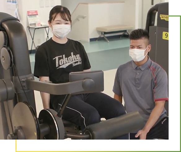 私は現在メディカルフィットネス施設でトレーナーとして運動指導をしています。会員様に合わせたトレーニングメニューの提案をするのが主な仕事です。ここに通う会員様は元気で健康な方ばかりでなく、腰やひざに痛みのある方もいらっしゃいます。糖尿病などの生活習慣病を抱えて通われる方もいらっしゃいますので、負荷の設定やトレーニング種目の選定に気を配り、その方に合ったメニューを作成し提案しています。