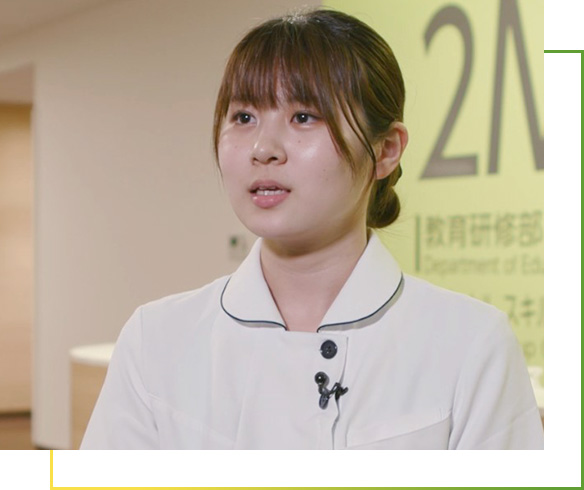 看護師になってまだ2年目。将来の目標や夢というよりは、目の前の患者さんが求めていること、いろいろな思いを汲み取り、それに精いっぱい応えることを大切にしたいと考えています。その上でさらに患者さんのニーズ+αの対応ができたらいいなと思っています。