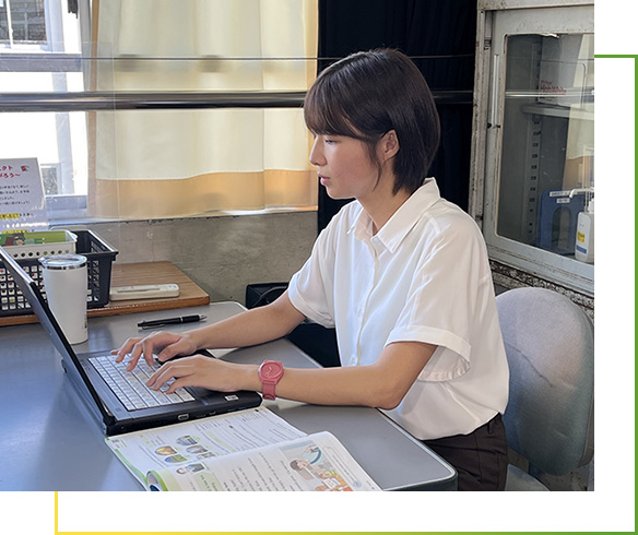 夢を実現し、今は中学2年生のクラス担任と英語の授業を受け持ちながら、吹奏楽部の顧問を担当しています。