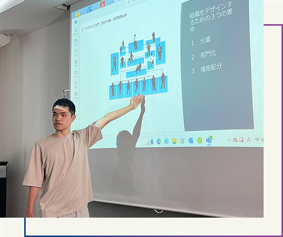 マーケティングゼミでは、自分でプレゼンテーションを行い、他のゼミ生の前で発表をします。自分の考えを周りに伝えるという経験が自分にとってプラスになっています。