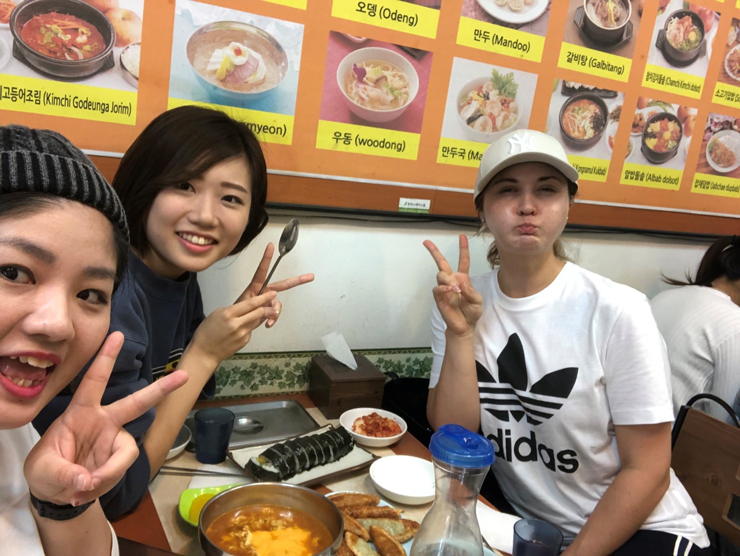 私は同じクラスの日本人とスウェーデン人の学生と仲良くなり、授業が終わってからよくお昼ご飯を一緒に食べています。右の写真は、大学の最寄り駅の近くにあるお店に行った時の写真です。趣味や、お互いの国について、韓国語を勉強し始めた理由など、色々な話をしました。初めて知ることがたくさんあり、とても面白いです。