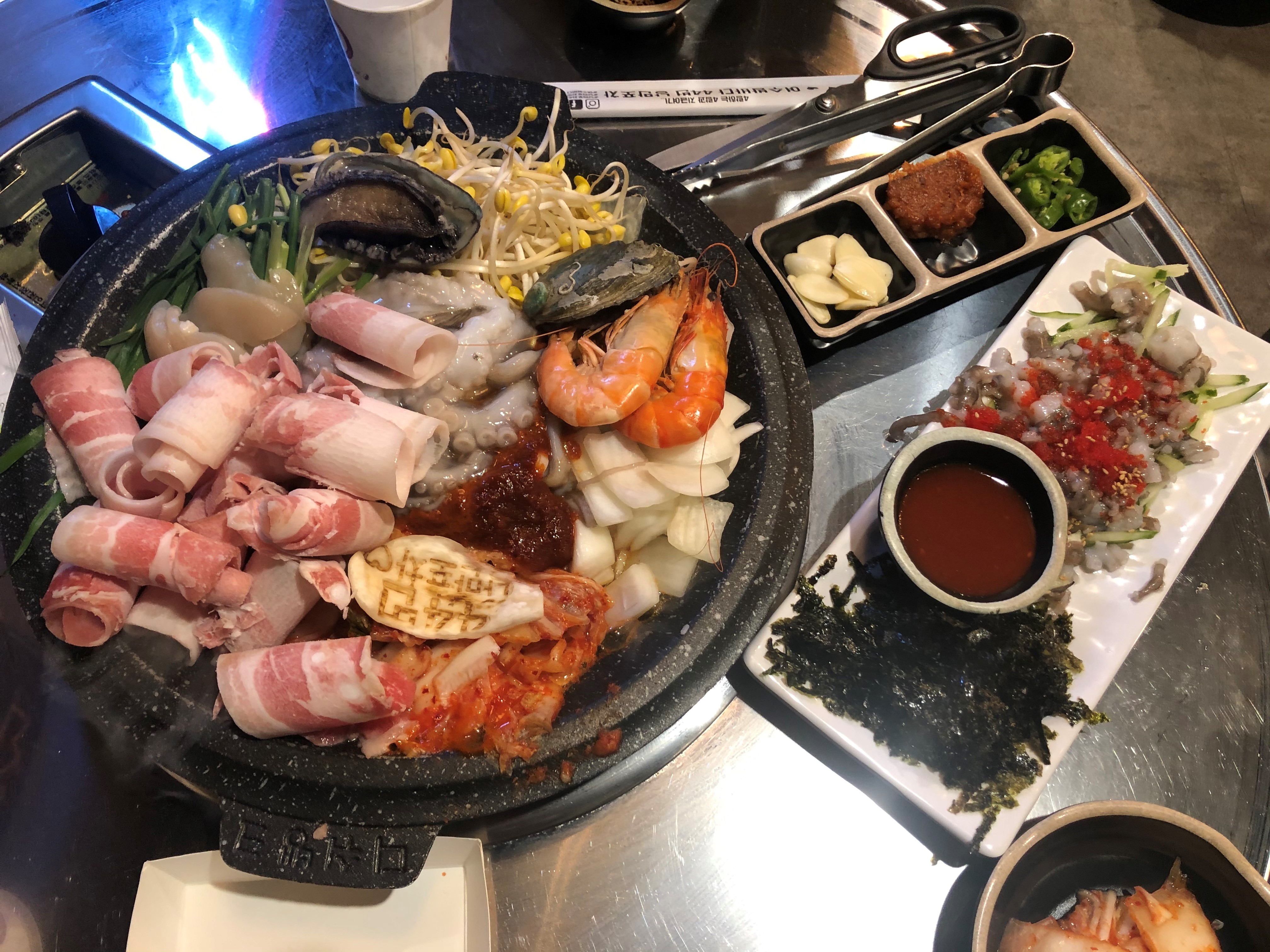 中には、豚肉・タコ・エビ・アワビ・ホタテ・キムチ・もやし・ニラ・玉ねぎ・白菜と