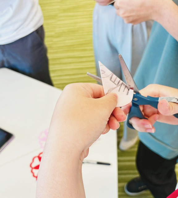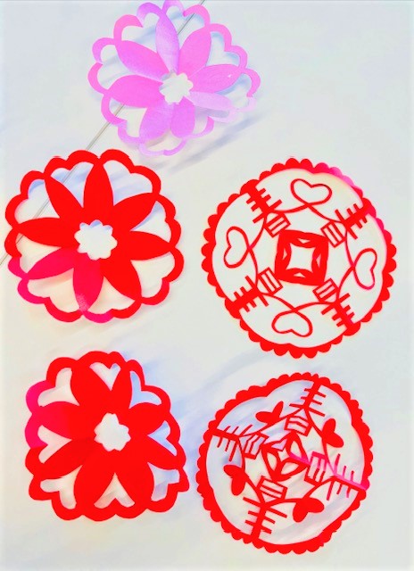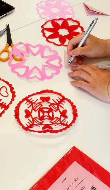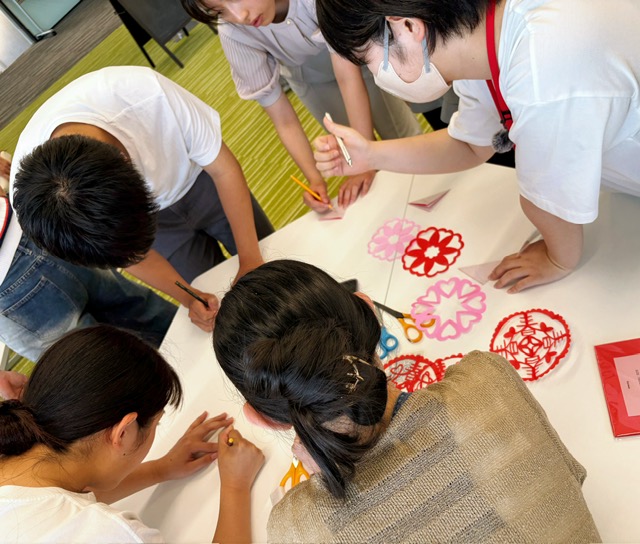 中国の「剪紙(せんし)」は、紙をハサミなどで切り、繋げたまま模様を作る民間工芸です。日本でも「切り絵」は知られていますが、剪紙に描かれるものは、主に中国で縁起がいいとされているものや、人々の願いなどが込められています。細かい部分を切り取る作業は集中力が必要でしたが、完成した剪紙を広げた時はきれいな仕上がりにとても満足していました。
