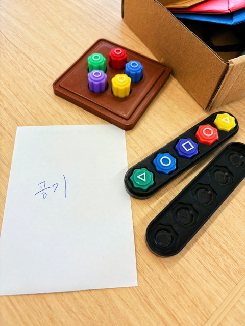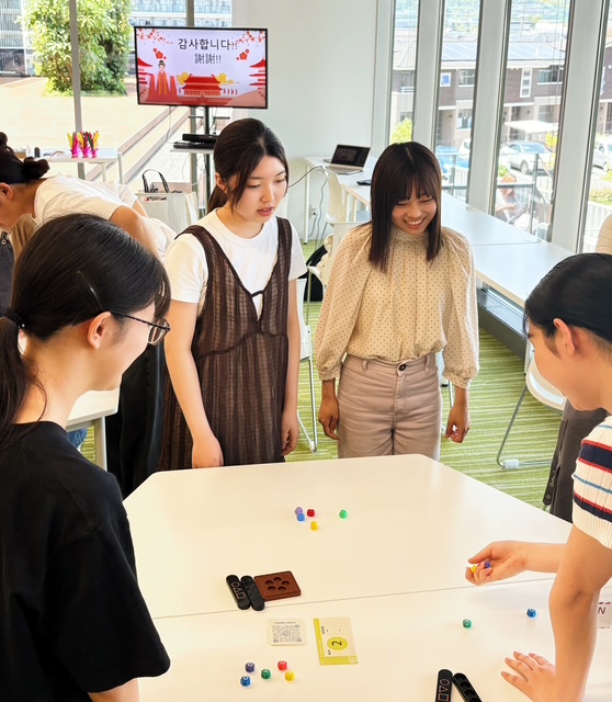 韓国ドラマ『イカゲーム2』にも登場する「コンギ」は、小さな5個の駒を使うもので、どこでも気軽に遊ぶことができます。手先の器用さが求められるゲームでもあるため、難しいという声が多かったものの、参加した学生も成功するまで繰り返しチャレンジして楽しんでいました。