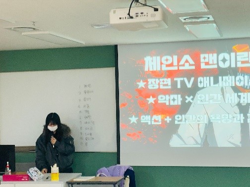 1学期間に1度ある発表授業では前学期と変わってテーマを自分で設定する形式だった。クラスメイトは自分の故郷紹介や流行したスイーツの世代分析、外国語学習の動機など多様な題材を取り上げていた。わたしは韓国でも高い人気を得た日本のアニメーション映画について発表を行った〈写真1〉が、習った文法を取り入れながら自分のわかる表現で原稿やプレゼンを作るのに苦戦した。自由度が高い分、扱う範囲も広がり、前学期以上に準備の大変さを感じた。